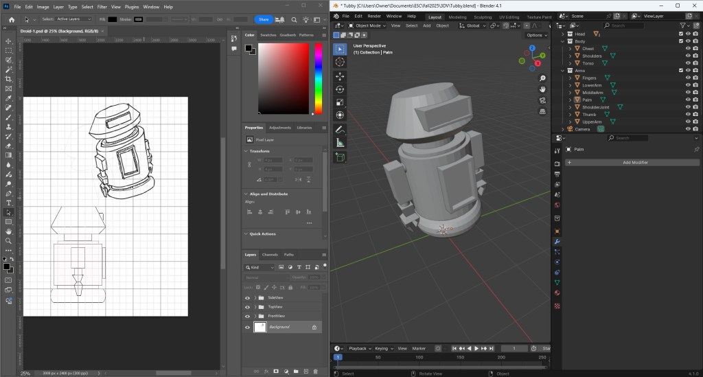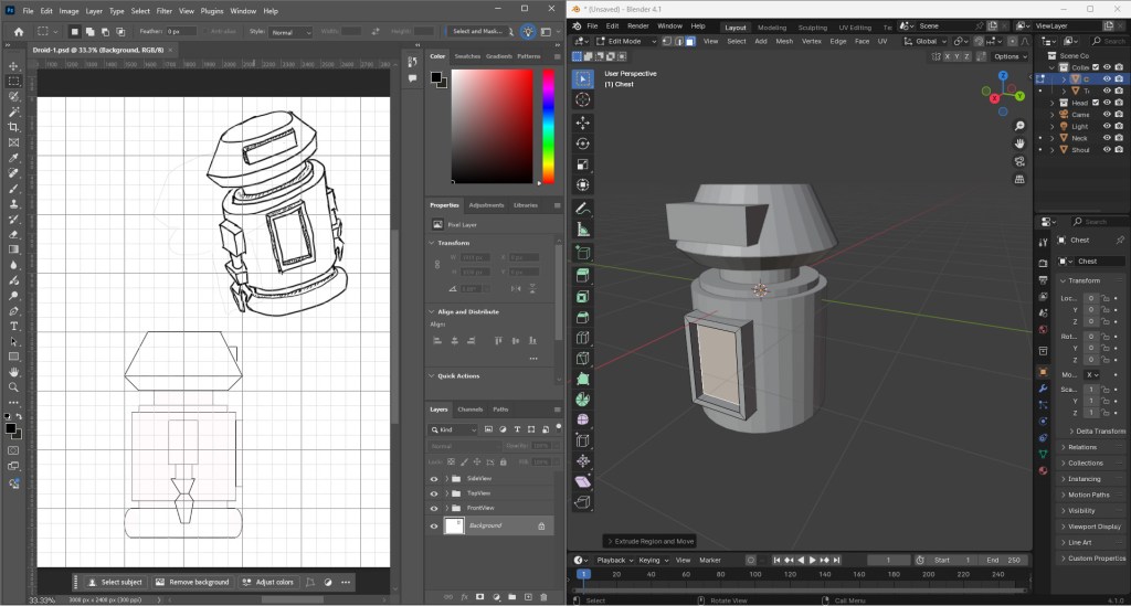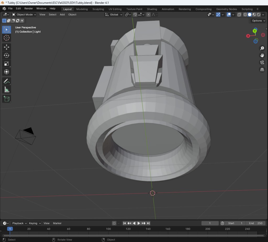 When the time came to actually build Tubby in Blender, I would’ve been totally lost if not for an awesome tutorial from Brad’s Art School on YouTube. Brad did an amazing job of explaining the basics of Blender and kept me entertained and motivated throughout the video. Working through the lesson and building a car with Brad taught me all I needed to know to accomplish this week’s task.