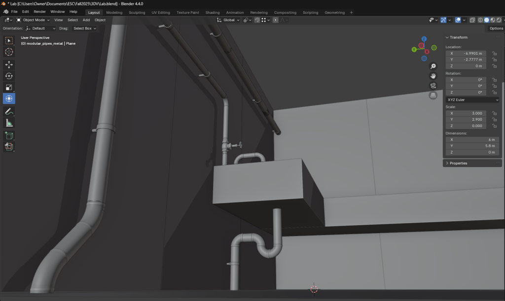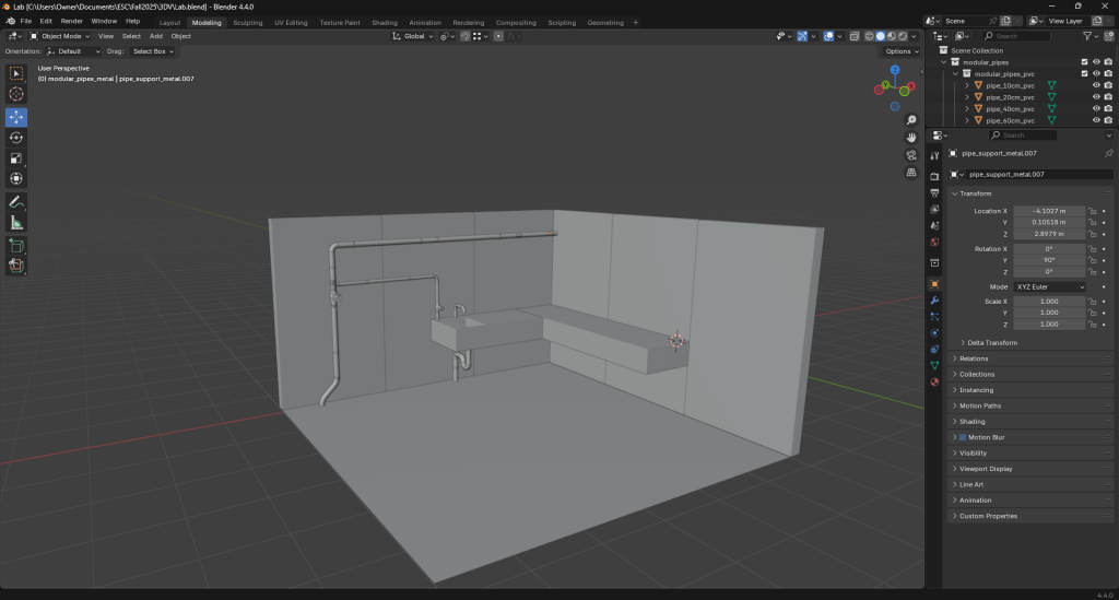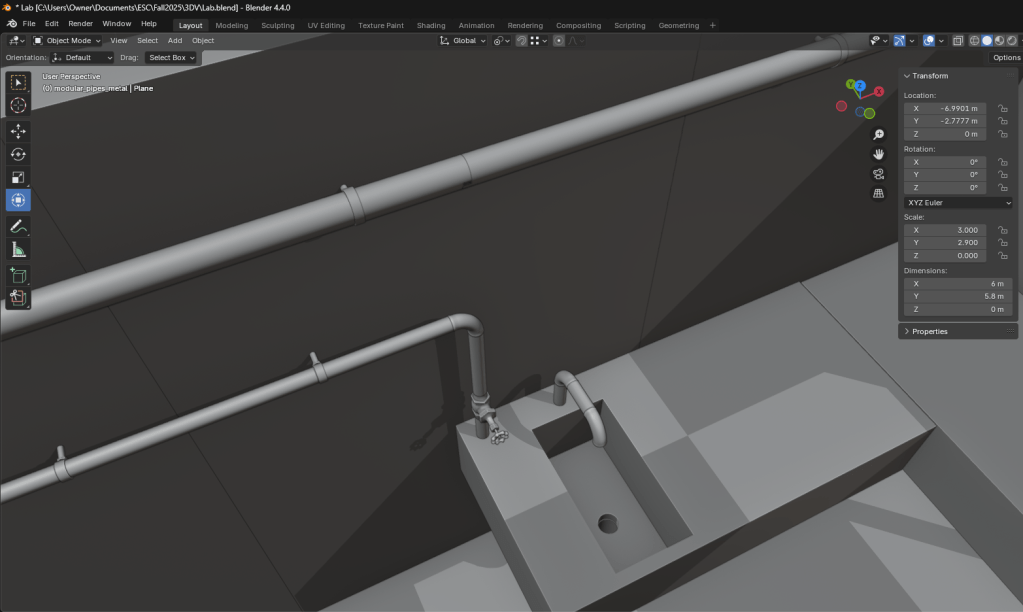 It took some time and patience, but with the use of the duplicate, move, rotate, and transform tools I was able to add pipes and connect them to the wall. The sink was made using loop cuts, insetting, and a pipe boolean cut for the drain. Together with the counter, this created the basic lab.