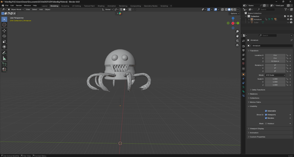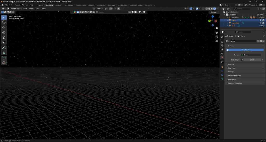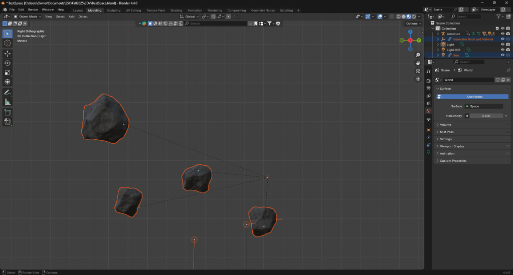After looking for additional assets I reconsidered the setting for my scene and decided to have it set in outer space. I found a nice environment map on Blenderkit that worked well for this scenario. Additionally, I found some premade meteors and an alien on Blenderkit that I will be working into the scene.