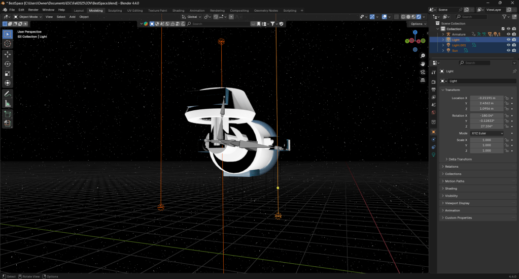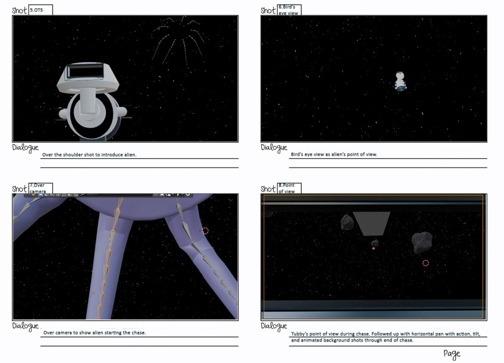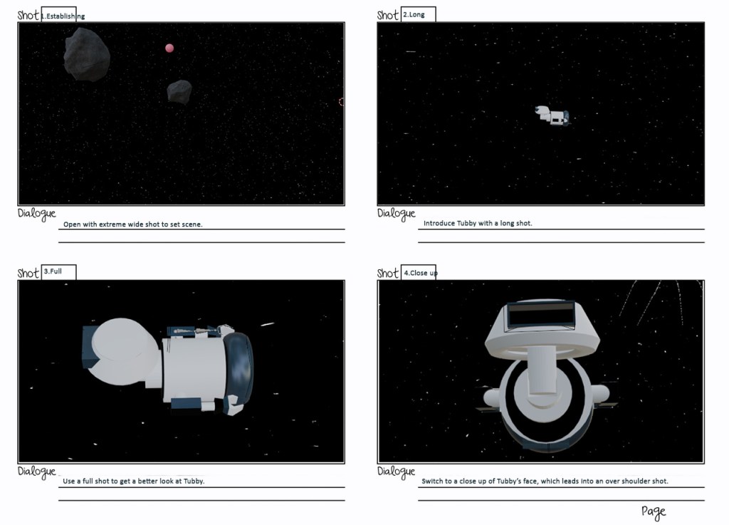 For my final 3D project, I propose an animated scene with Tubby the robot in outer space. I originally planned to have a scene in a lab, but I had a different idea while searching for assets. The new scene will follow Tubby as he flies through space and encounters a rather scary alien. I will establish the scene, introduce Tubby and then the alien, and depict a short chase. I found a nice environment map of space that works well for this scenario. I also found a premade alien and some meteors on Blenderkit. Tubby’s texture was found on Polyhaven. Tubby and the alien will be rigged for better interaction, and I’ll be using 3 point lighting on the subjects to make them visible in the darkness of space. I’ll open with an extreme wide shot of the environment, then move to a long shot to introduce Tubby. Next will be a full shot of Tubby, followed by a closeup of his face that transitions to an over the shoulder shot to introduce the alien. Then there will be a bird’s eye view to illustrate the alien’s point of view as it watches Tubby. The chase will begin with an over camera shot of the alien as it goes after Tubby. The rest of the chase will switch between Tubby’s point of view, a horizontal pan with action, a tilt, and animated background shots. The ending will likely be either a closeup or a full shot of Tubby.