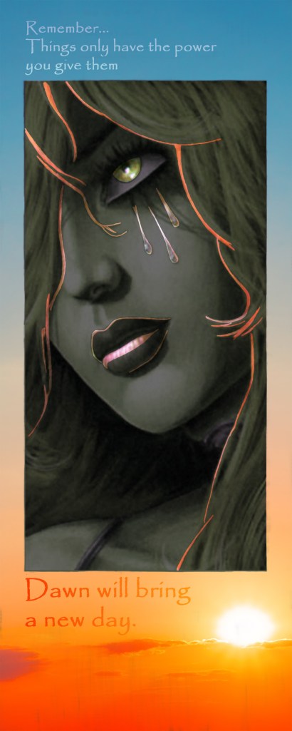 For this assignment, I thought of a character and quote from a comic book I like called Dawn by Joseph Michael Linsner. I started out with a blank canvas and used the Crop tool to grab a section of an image of the dawn from Adobe Stock. I then fit it to the canvas as the background. Then I used the Frame tool to create an area to import an image of the character Dawn by Linsner. After sizing and positioning the image, I used the Horizontal Type Mask tool to add the quote and other text. The text was then filled using gradients. Next, I added a hue/saturation adjustment layer to the frame to grey out most of the color. I removed parts of the mask to highlight Dawn’s identifying characteristics – her eye color, the tears on her cheek, and her hair.