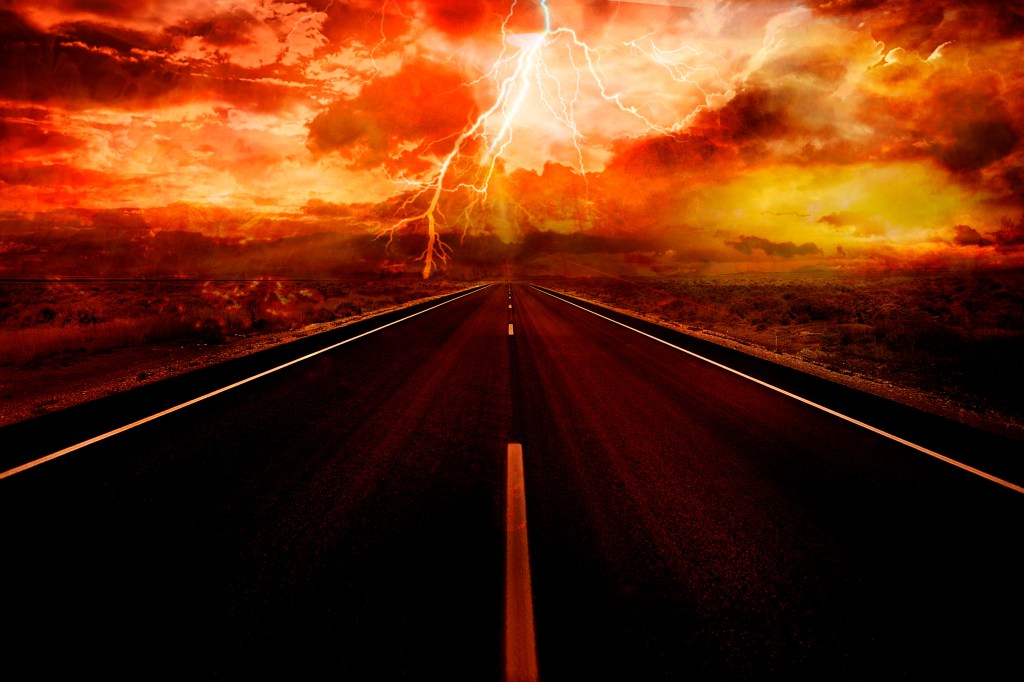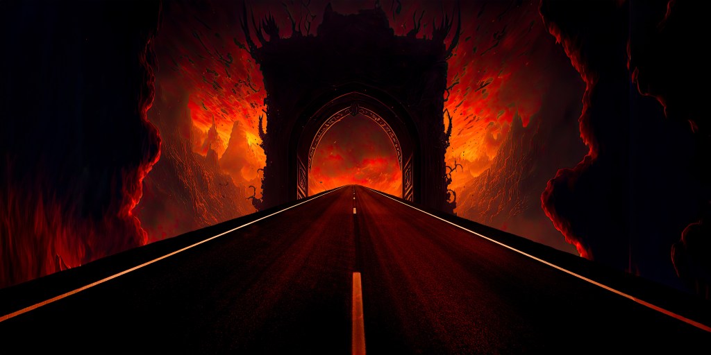 It made me think of the song “Highway to Hell”, and I found a picture of a Hellscape on Adobe Stock that worked perfectly. I layered the road onto the Hellscape with a dissolve blend and left it at that, as the coloring, perspective, and overall feel seemed right as it was.