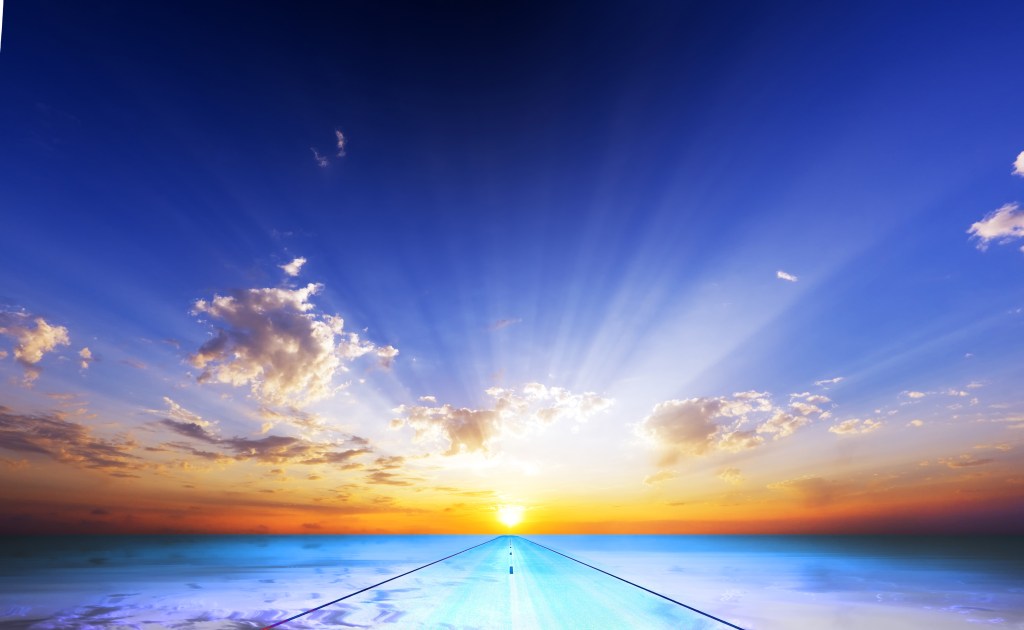 On the flipside to the previous image, I then thought of the old TV show “Highway to Heaven”. For that, I used an Adobe Stock photo of a sunset with a gradient layer and hue blending mode to more clearly define the horizon and change the coloring of the road.